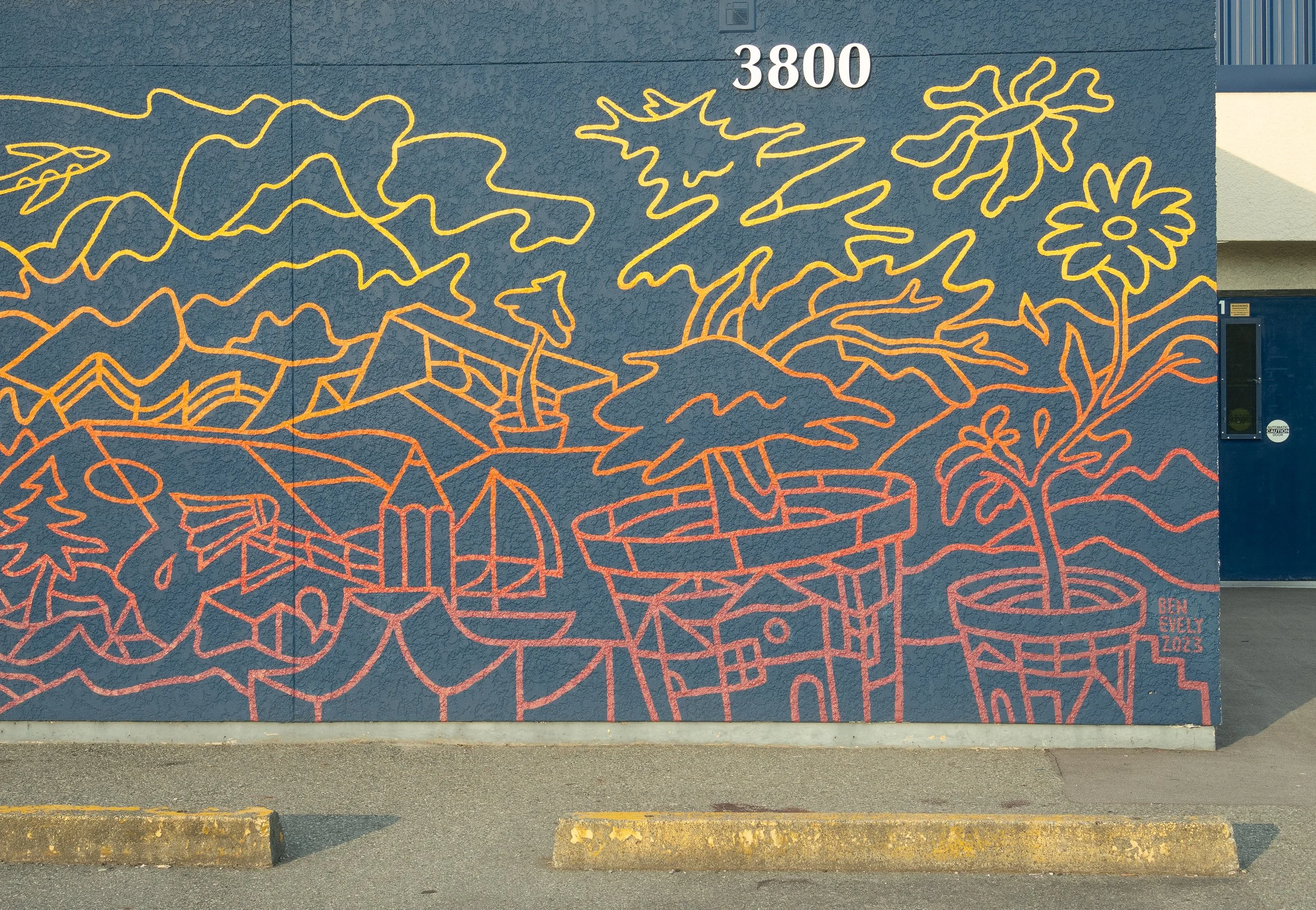 The central theme for the mural: Movements That Make Us, is active forms of identity. Traits which are formed by interests and actions. The design reflects the most prevalent themes from engagement sessions with students and staff at Mitchell Elementary School in Richmond, BC. Students responded to prompts with drawings and writing about their passions and curiosities, and spaces they feel comfortable or at home in.